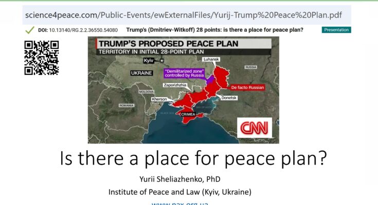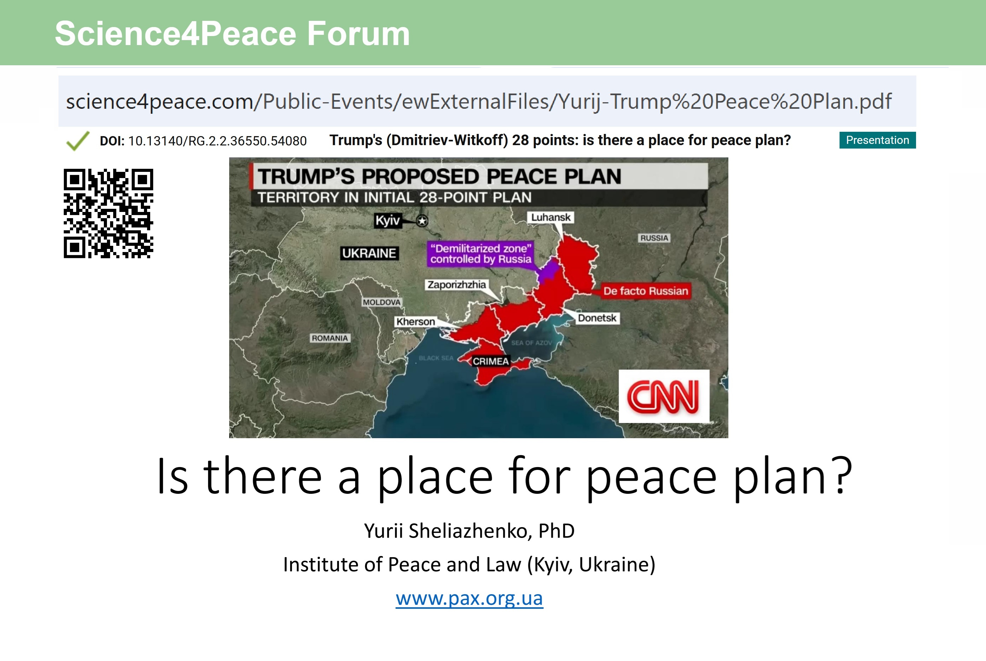 У своїй презентації на вебінарі «Мирний план Трампа», організованому форумом Science4Peace, я пояснив, що мирна угода чи навіть крихке припинення вогню на умовах, запропонованих у 28 пунктах, навряд чи відбудеться, оскільки український уряд не збирається відмовлятися від конституційних територій України, прагнень євроатлантичної інтеграції, суверенітету, а російський уряд не збирається відмовлятися від претензій і завойовницьких планів, пов’язаних з тимчасово окупованими територіями України та сферою впливу “великої держави”.